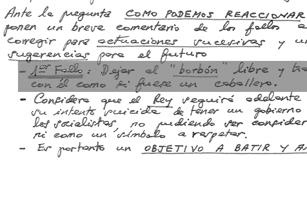 Ce n'était pas une exhortation hésitante. Don Juan Carlos lui adresse un message clair et solennel : « Je te fais savoir très clairement ce qui suit : 1. J’affirme ma décision catégorique de maintenir l’ordre constitutionnel dans le cadre de la légalité en vigueur. Après ce message je ne peux plus revenir en arrière. 2. Aucun coup d’État ne pourra s’abriter derrière le Roi, il est contre le Roi. 3. Aujourd’hui plus que jamais, je suis prêt à tenir le serment à la Bandeau. Pour cela, très consciemment et en ne pensant qu’à l’Espagne, je t’ordonne de retirer toutes les unités que tu as déplacées. 4. Je t’ordonne de dire à Tejero qu’il dépose immédiatement son attitude. 5. Je jure que je n’abdiquerai pas la Couronne, ni n’abandonnerai l’Espagne. Qui se soulève est prêt à provoquer et sera responsable d’une nouvelle guerre civile. 6. Je ne doute pas de l’amour de mes généraux pour l’Espagne. Pour l’Espagne d’abord, et pour la Couronne ensuite, je t’ordonne de faire ce que je t’ai dit. »